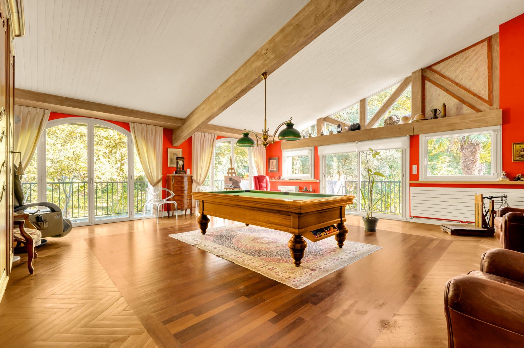 Au rez-de-chaussée, un salon de réception de plus de 100 m² orné d’une cheminée monumentale en brique, une salle de billard, deux suites et un bureau.