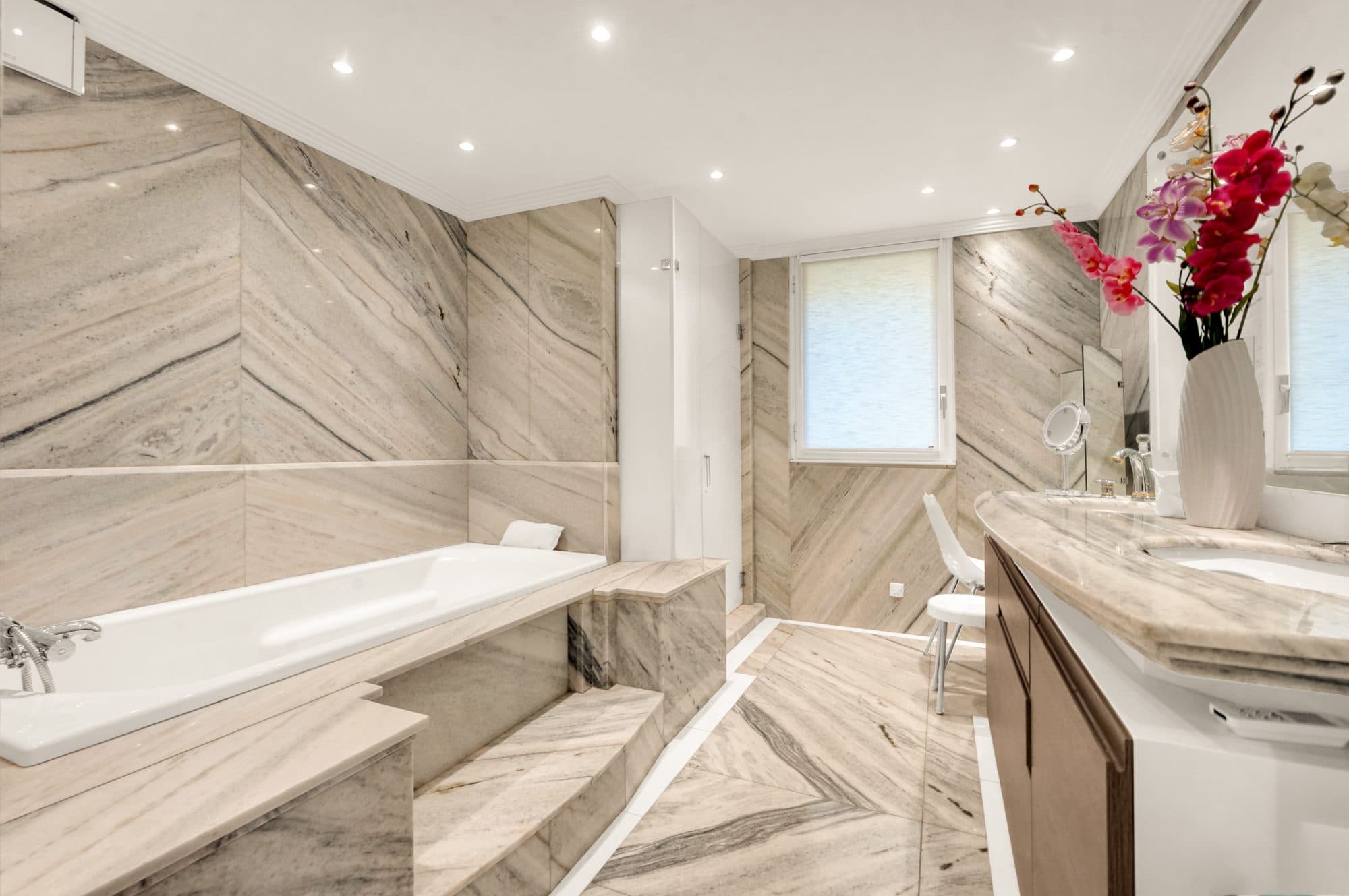 Au rez-de-jardin, trois suites supplémentaires, une salle de jeux et une salle de cinéma ouvrent directement sur le parc.