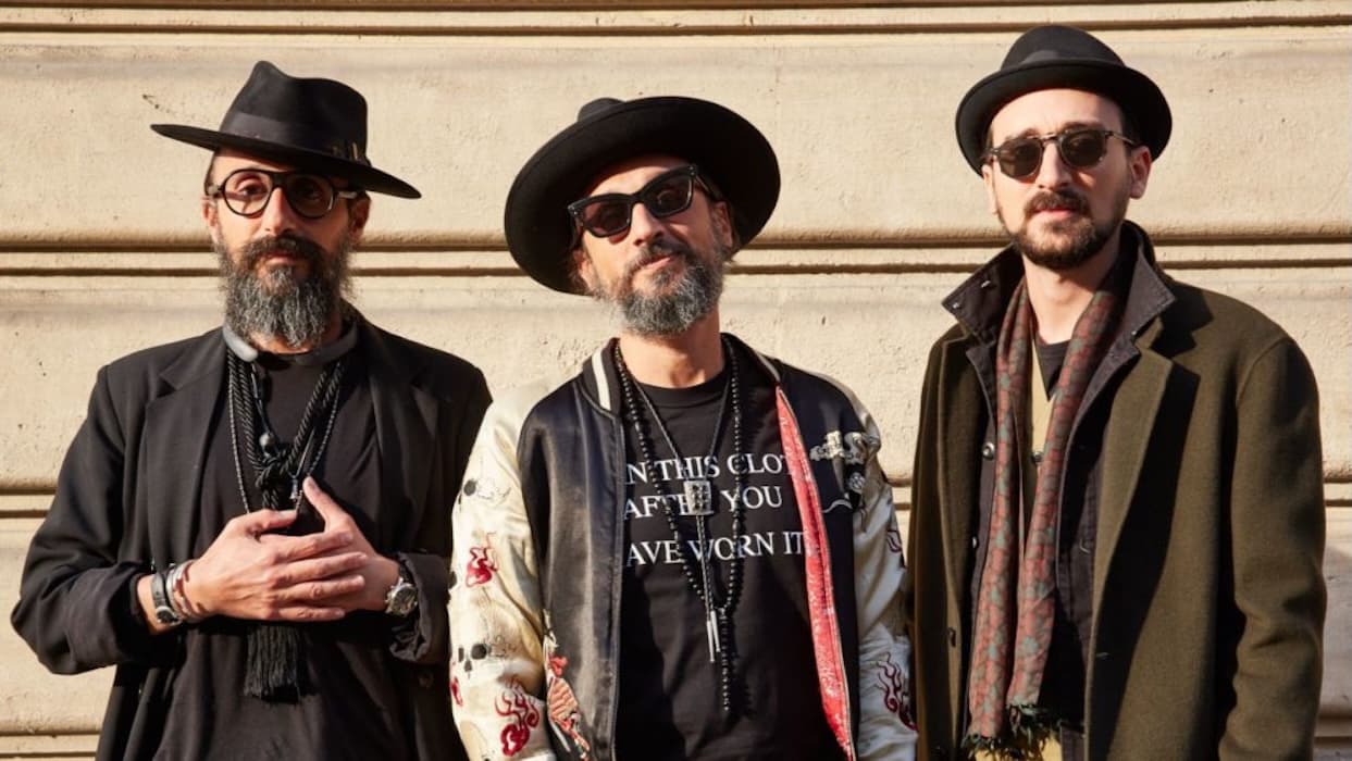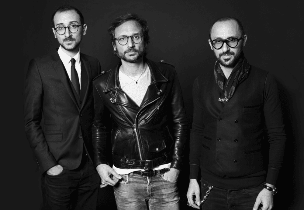 Raphaël, troisième de la fratrie, n’est pas là aujourd’hui. « Il se dore la pilule à Capri », annonce Alexandre en riant. Il porte un blouson de yakuza vintage en satin, un pantalon à rayures noires et blanches et des bijoux. Laurent, lui, affiche un sweat-shirt noir et des tsitsit (franges hébraïques). Tous deux arborent des barbes et des chapeaux Fedora. Ce méli-mélo d’influences vestimentaires aurait pu être catastrophique… Et pourtant, sur eux, il marche d’enfer. « La clef, c’est le dosage, dit Laurent pendant qu’Alexandre s’approche du sound system. C’est pareil avec Sunrise. La collection est, à parts égales, folk, rock, hippie et inspirée du Japon. On adore les mélanges. »